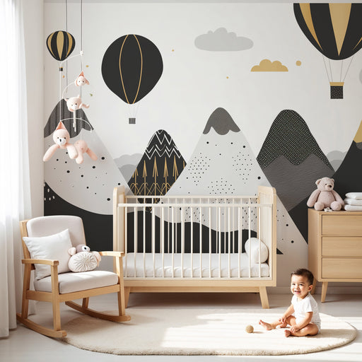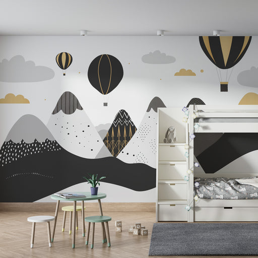 Papel de parede criança | Montanhas monocromáticas e balões de ar quente sonhadores