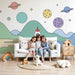 Os tons suaves de verde, azul e pastel criam uma atmosfera agradável e serena, enquanto os inúmeros planetas trazem um toque de mistério e curiosidade. Cada elemento é ilustrado com cuidado, oferecendo um visual divertido e atraente que vai fascinar o seu pequeno astronauta.