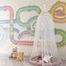 Os tons alegres de azul, verde, rosa e amarelo trazem uma atmosfera dinâmica e divertida, perfeita para encorajar a descoberta e o jogo. Esta decoração interativa convida as crianças a explorar e inventar as suas próprias histórias, enquanto adiciona um toque de alegria ao seu espaço.