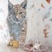 As tonalidades primaveris de azul e laranja, realçadas por toques de aquarela, criam um ambiente dinâmico e ao mesmo tempo calmante. Cada detalhe do lince, desde o seu olhar penetrante até à sua pelagem de grande delicadeza, é cuidadosamente ilustrado, trazendo um aspecto realista e inspirador que irá agradar aos pequenos aventureiros.