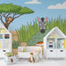 Os tons vivos de verdes e castanhos naturais, combinados com um céu azul claro e nuvens fofas, trazem uma atmosfera alegre e tranquila. Cada detalhe, desde o padrão às riscas da zebra até às folhas exuberantes, é cuidadosamente concebido para despertar a curiosidade do seu pequeno.