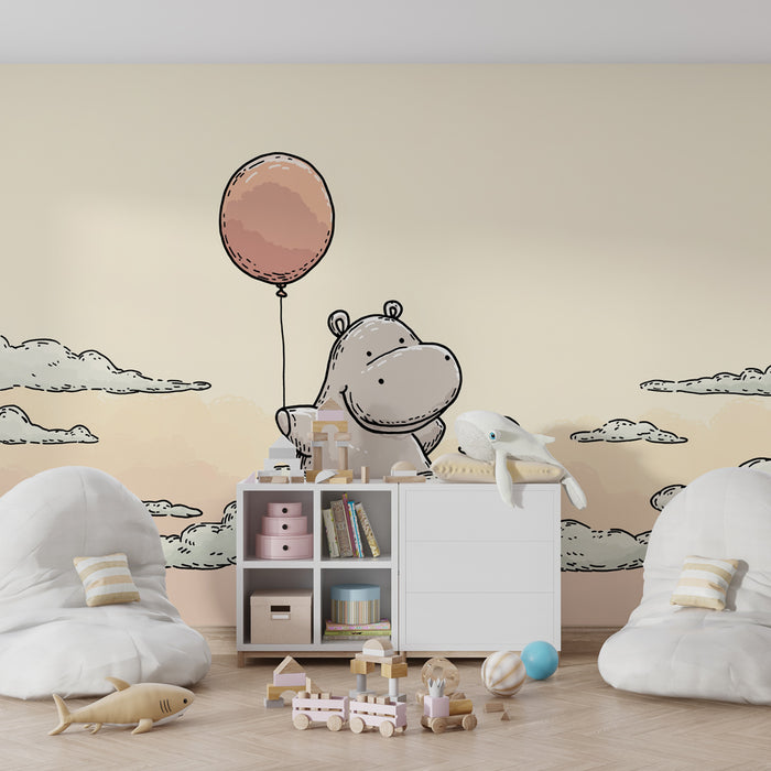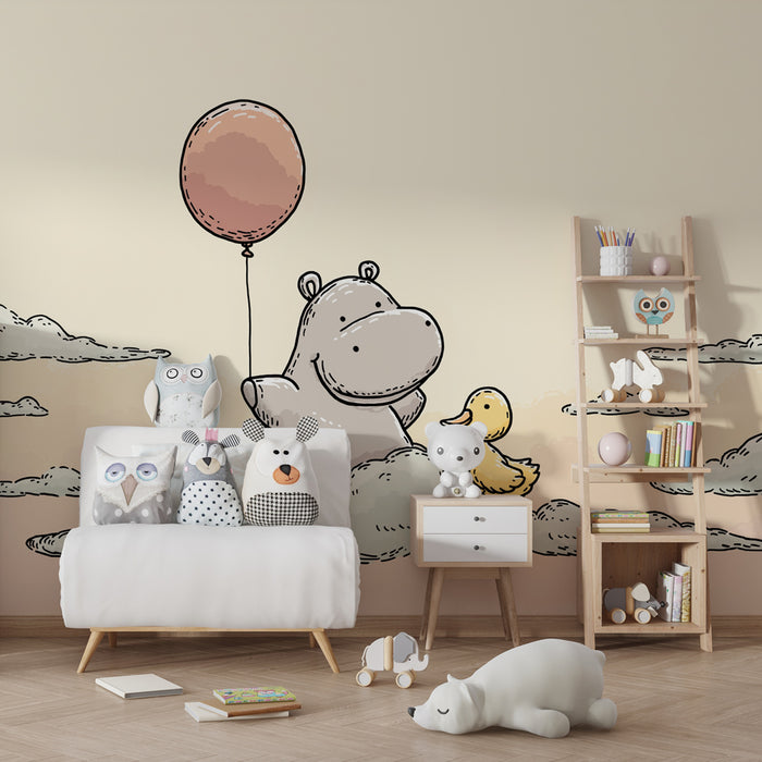 Papel de parede quarto bebê | Hipopótamo feliz e pato nas nuvens
