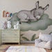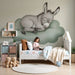 As suaves tonalidades de cinza e verde criam uma atmosfera calmante, enquanto as folhas tropicais na base acrescentam um toque de natureza. Cada detalhe, desde o pêlo do burro até às formas arredondadas da nuvem, é cuidadosamente concebido para despertar a imaginação das crianças e promover um ambiente tranquilo e reconfortante.