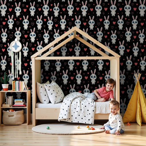 KidsWallDescoperiți tapetul nostru de iepure care prezintă un model adorabil de iepurași albi cu ochi mari, însoțiți de inimi roșii pe un fundal negru. Ace...