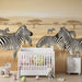 Nuantele calde de bej și maro adaugă o notă de căldură și confort încăperii, în timp ce siluetele de acacii din fundal evocă imensitatea naturii. Fiecare detaliu, de la modelele de zebre la ondulațiile ierbii, este conceput cu grijă pentru a stimula imaginația copilului dvs.