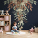 Tapet pentru camera de bebeluși | Flori delicate și frunziș pe fundal stelat
