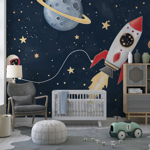 Afișați toate detaliileTapet camera copilului | Aventură spațială fermecată cu rachetă și planetă înstelată