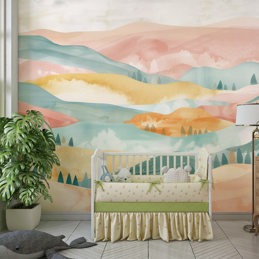 Tapet cameră bebeluș | Peisaj acuarelă pastel și coline onirice