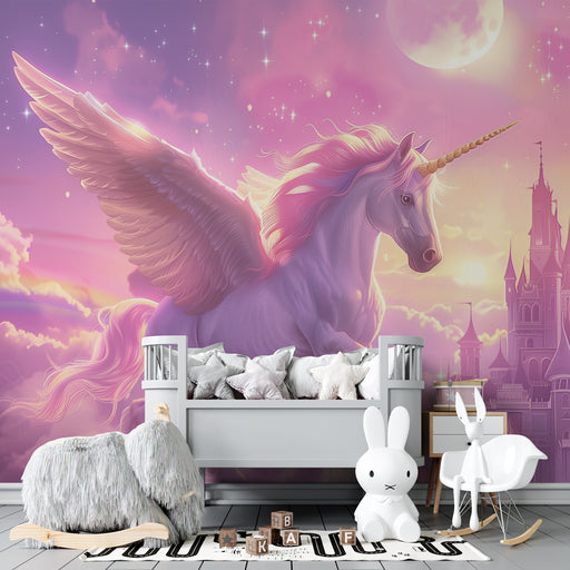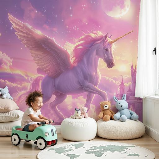 KidsWallOferiți copilului dumneavoastră o călătorie în inima unui vis fermecat cu acest tapet pentru camera copilului. O unicornă înaripată majestuoasă tra...