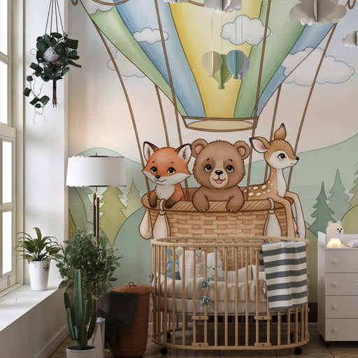 Tapet pentru cameră de copii | Balon cu aer cald și prieteni din pădure