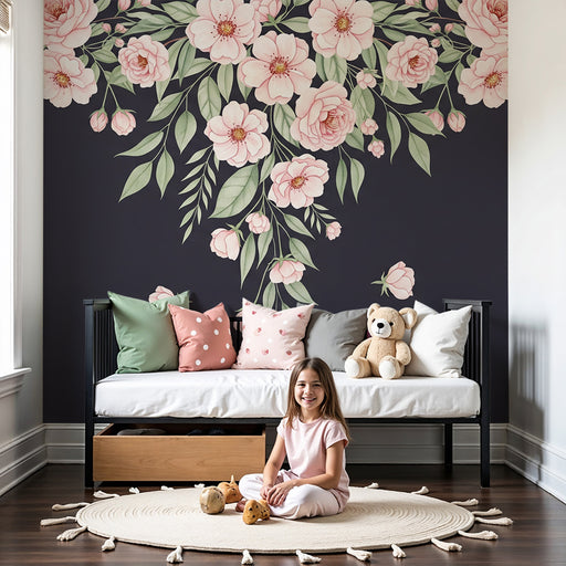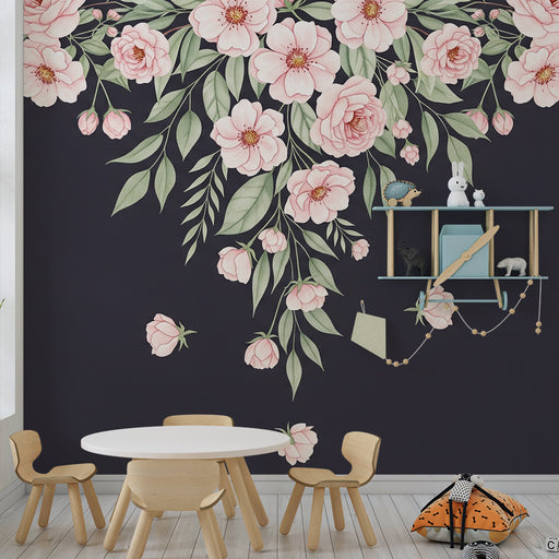 Afișați toate detaliileTapet cameră bebeluși | Flori roz suspendate pe fundal întunecat