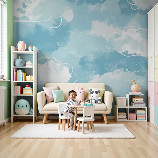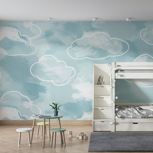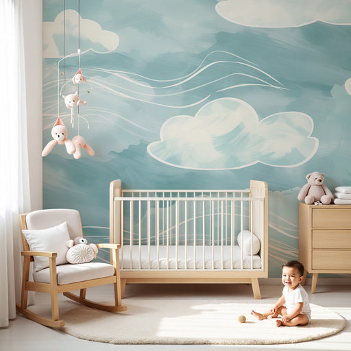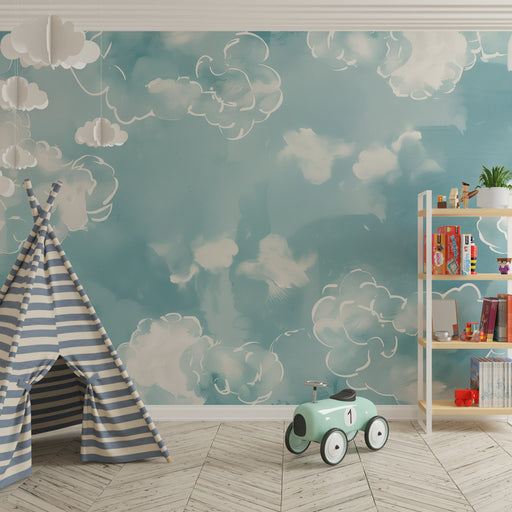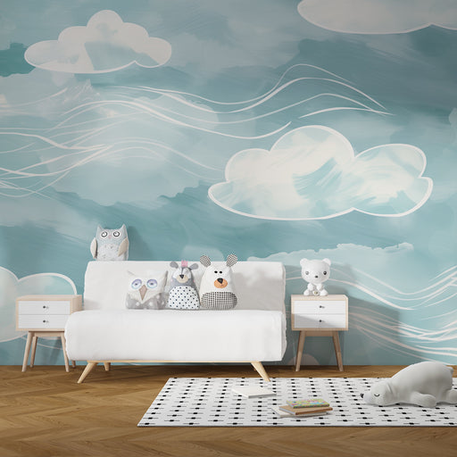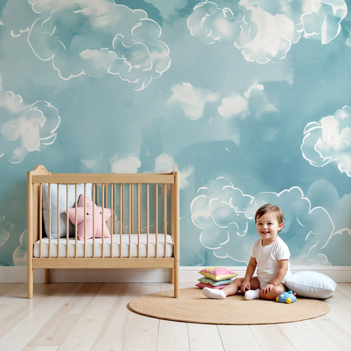 KidsWallCreați un cocon de tandrețe cu acest tapet pentru camera bebelușului. Nori mari și pufoși, pictați în acuarelă, plutesc într-un cer albastru linișt...
