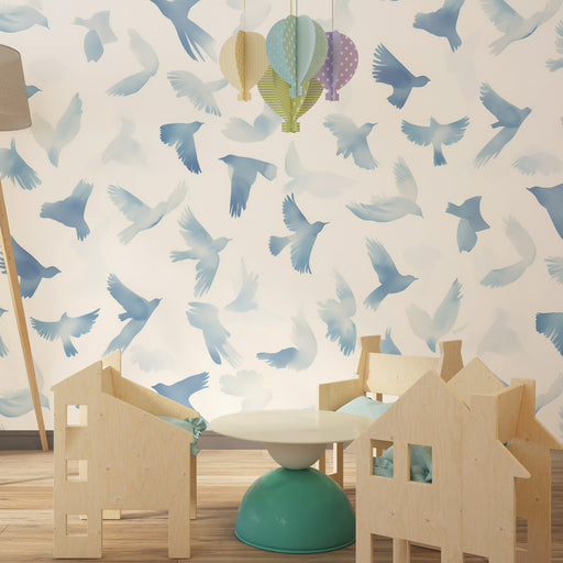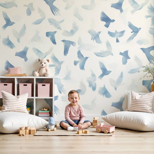 KidsWallScufundați-vă copilul într-un cer plin de ușurință cu acest tapet pentru camera bebelușului. Un nor de păsări în zbor, pictate în acuarelă în nuanț...