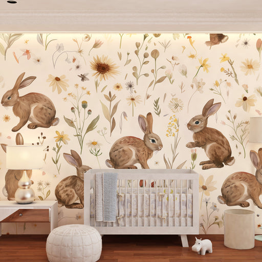 Tapet cameră bebeluș | Iepuri și flori de primăvară în acuarelă