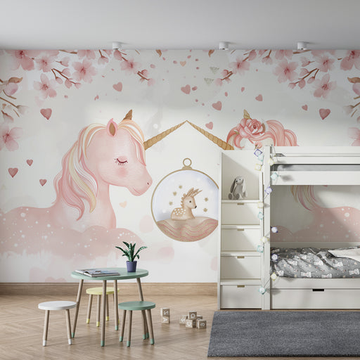 Afișați toate detaliileTapet cameră bebeluș | Unicorni visători și flori de cireș în acuarelă
