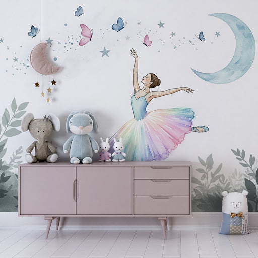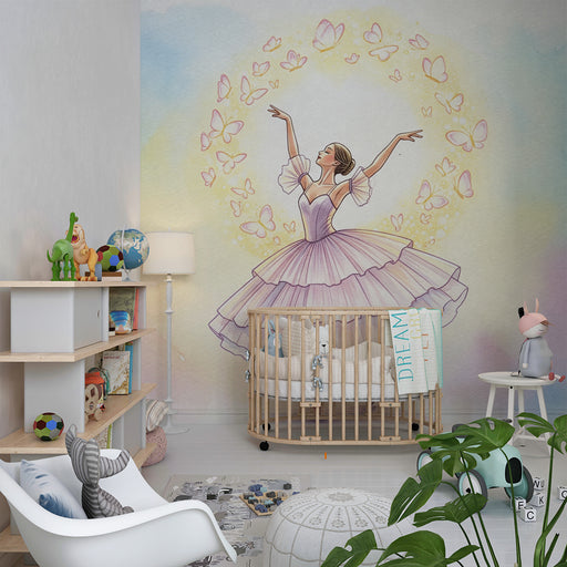 KidsWallÎmbătătoriți-vă într-o lume magică cu acest tapet pentru bebeluși care prezintă o balerină delicată înconjurată de fluturi grațioși. Această ilustr...