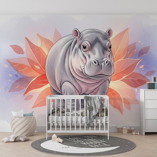 KidsWallTransformați camera copilului dvs. într-un spațiu de cocon cu acest tapet pentru copii ilustrând un hipopotam adorabil înconjurat de frunze delicat...