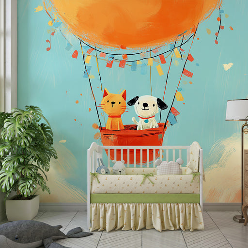 Tapet pentru camera copilului | Balon cu aer colorat cu pisică și câine