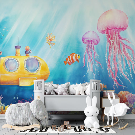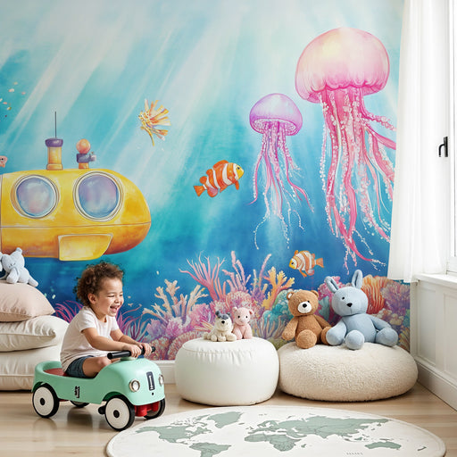 Afișați toate detaliileTapet cameră copil | Aventură subacvatică cu submarin galben și meduze colorate