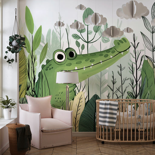 Afișați toate detaliileTapet camera copil | Crocodil simpatic în mijlocul frunzelor