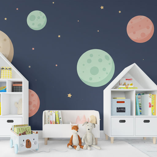 KidsWallTransformați camera copilului dvs. într-un adevărat cer înstelat cu acest tapet pentru copii inspirat din univers. Planetele cu nuanțe blânde și lu...