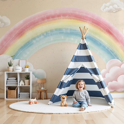 KidsWallImaginați-vă un univers dulce și reconfortant, unde un curcubeu feeric traversează un cer plin de nori pufoși. Acest tapet pentru camera bebelușulu...