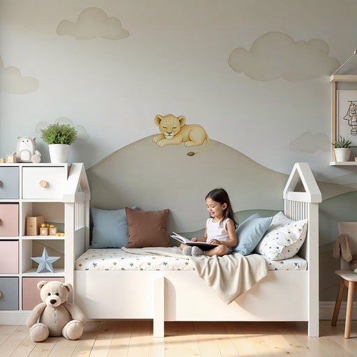 KidsWallTransformați camera bebelușului dvs. într-un spațiu confortabil cu acest tapet pentru bebeluși care reprezintă un pui de leu adorabil adormit pe de...