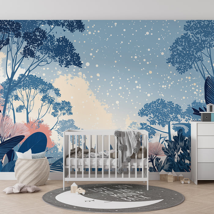Adăugați magia naturii în camera copilului dvs. cu acest tapet inspirat din pădurile tropicale. Sub un cer înstelat, siluetele elegante ale copacilor și frunzișul luxuriant creează o atmosferă liniștitoare și visătoare. Nuanțele de albastru se amestecă cu accente de roz, aducând o notă de dulceață și liniște în cameră.