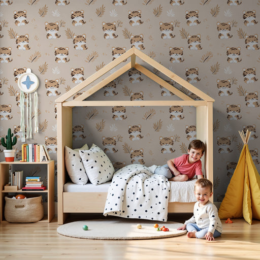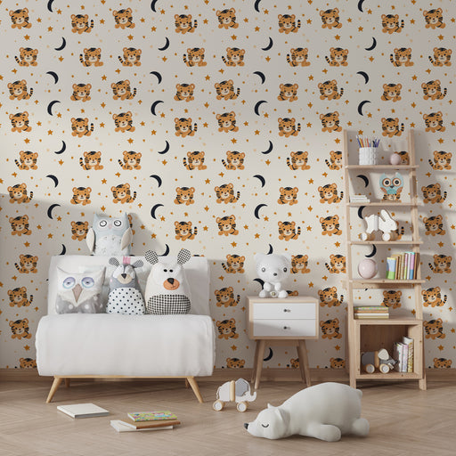 KidsWallTransformați camera copilului dvs. într-o lume fantastică cu acest tapet pentru cameră de copii decorat cu tigri mici fermecători, însoțiți de stel...