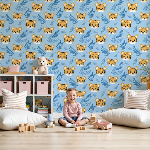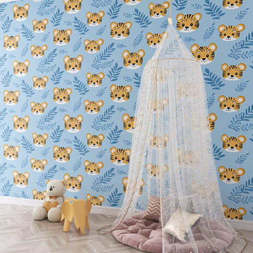 KidsWallAdăugați o notă ludică în camera copilului dvs. cu acest tapet pentru camera copilului, ilustrat cu capete de tigru adorabile pe un fundal albastru...