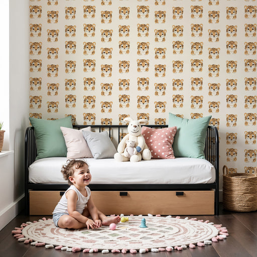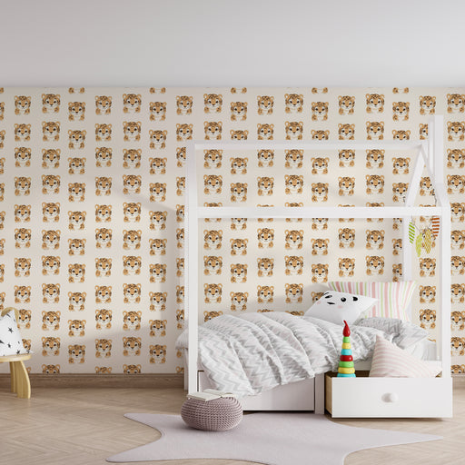 Afișați toate detaliileTapet pentru cameră de copii cu modele | Tigri adorabili desenați pe un fundal cremos