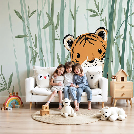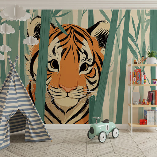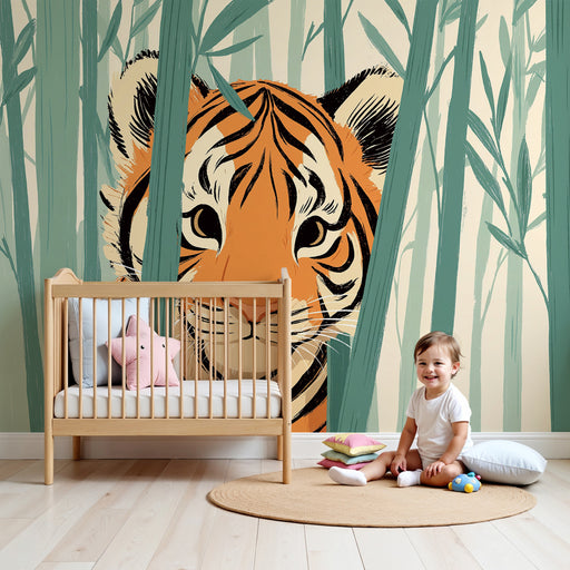 KidsWallÎnălțați-vă în universul sălbatic și misterios cu acest tapet pentru copii, unde un tigru vibrant se ascunde printre bambusi. Privirea sa pătrunzăt...
