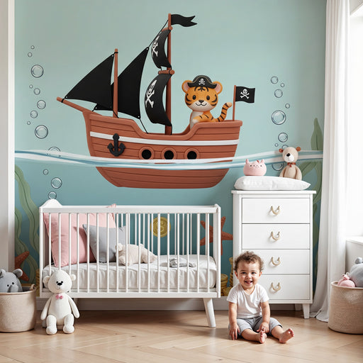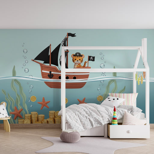 KidsWallÎmbarcați-vă într-o aventură maritimă cu acest tapet pentru copii care ilustrează un mic tigru pirat navigând pe nava sa. Sub valuri, comori strălu...