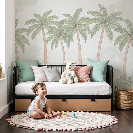 KidsWallAdăugați o notă tropicală în camera copilului dvs. cu acest tapet cu palmieri. Designul delicat și repetitiv al palmierilor mici verzi pe un fundal...