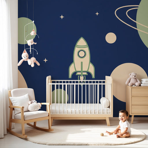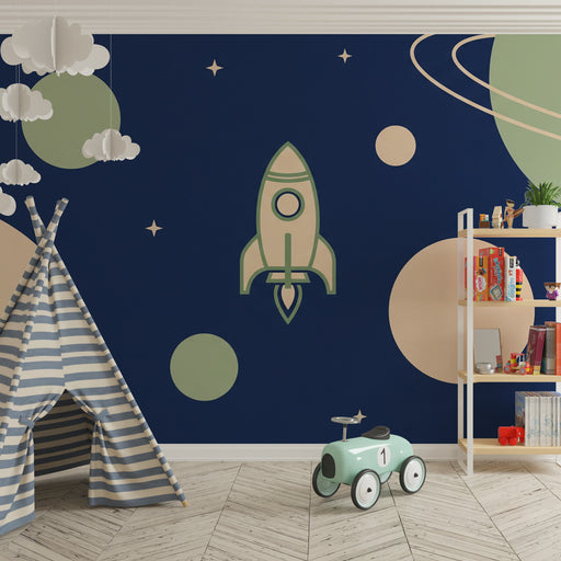 KidsWallDuceți-vă copilul într-o aventură cosmică cu acest tapet pentru camera copilului unde o rachetă decolează printr-un cer înstelat, înconjurată de pl...