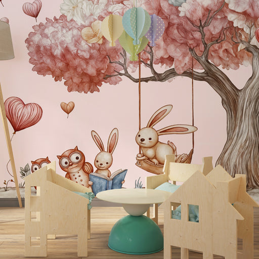 KidsWallTransformați camera copiilor într-o lume de vis cu tapet pentru copii care ilustrează un copac fermecat plin de animale dulci și de baloane cu aer ...