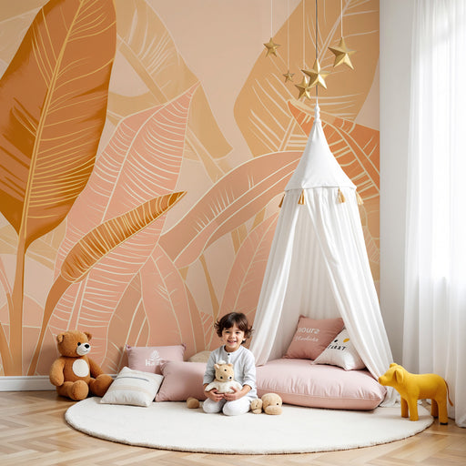 KidsWallCreează o atmosferă relaxantă și călduroasă în camera copilului tău cu acest tapet pentru copii cu modele de frunze tropicale. Nuanțele blânde de r...