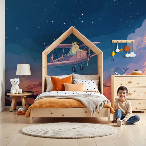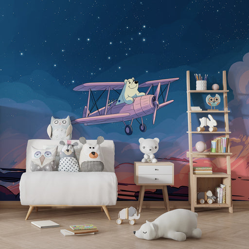 KidsWallÎmbarcați-vă în aventuri cerești cu acest tapet pentru copii care prezintă un urs pilot pe un avion roz. Plutind într-un cer stelat, acest urs ador...
