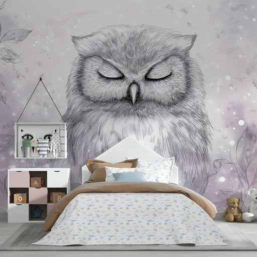 KidsWallÎmbunătățiți camera copilului dvs. cu acest tapet fermecător care prezintă o bufniță măiastră înconjurată de flori delicate. Nuanțele de mov și alb...