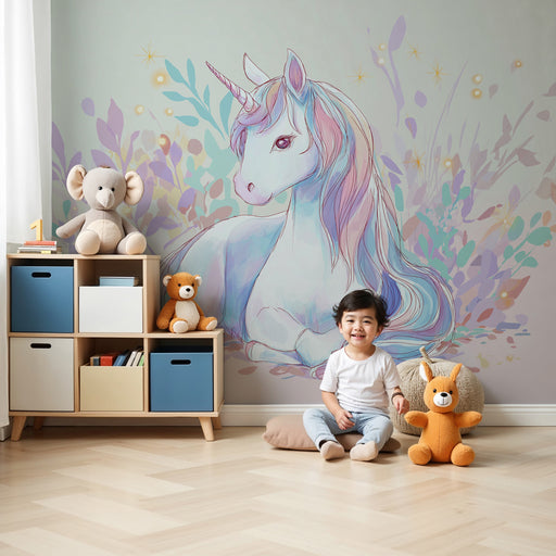 Afișați toate detaliileTapet camera copil | Unicorn pastel și natură fermecătoare