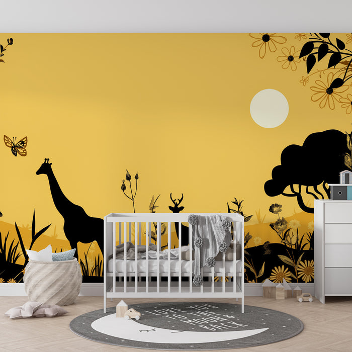 Siluetele grațioase ale animalelor se disting pe un fundal galben deschis, oferind o senzație de liniște și ușurință. Detaliile florale și plantele variate adaugă o notă colorată și vie întregului, stimulând imaginația și dragostea pentru natură a micului tău explorator.