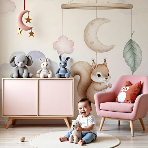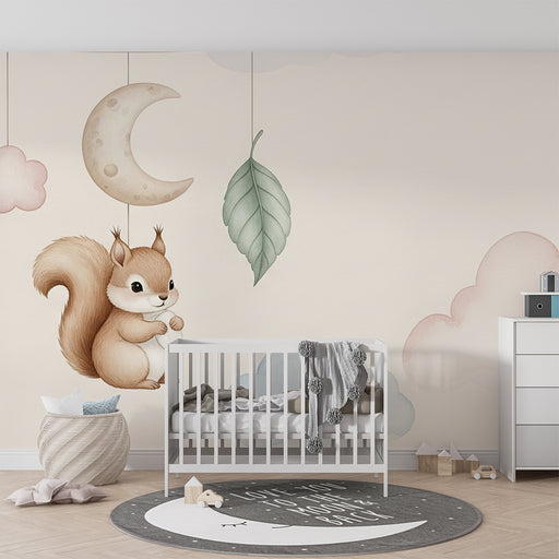 KidsWallPretransformujte izbu vášho bábätka do jemného útulku s týmto papier peint pre bábätká, ktorý zobrazuje rozkošného veveričku visiaceho medzi pastel...
