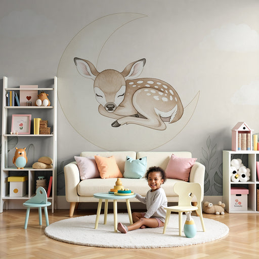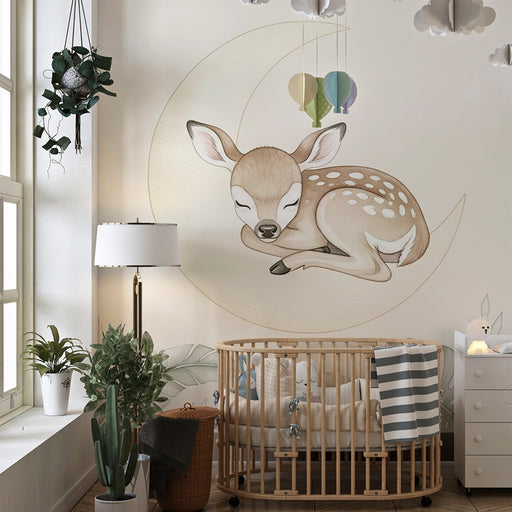 KidsWallVytvorte si v izbe vášho bábätka útulné miesto s týmto papier peint pre bábätká, ktorý zobrazuje očarujúceho jelena, ktorý pokojne spí na mesiačiku...