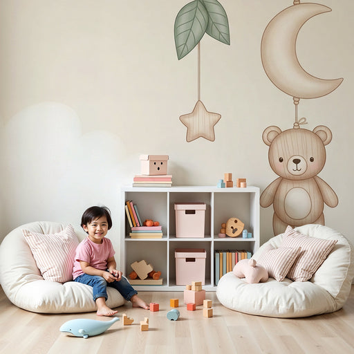 KidsWallTransformujte izbu vášho dieťaťa na skutočnú nočnú oblohu s týmto tapetou pre detskú izbu, ktorá zobrazuje roztomilého medveďa spať na zlatej mesia...