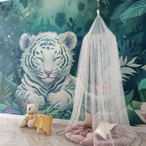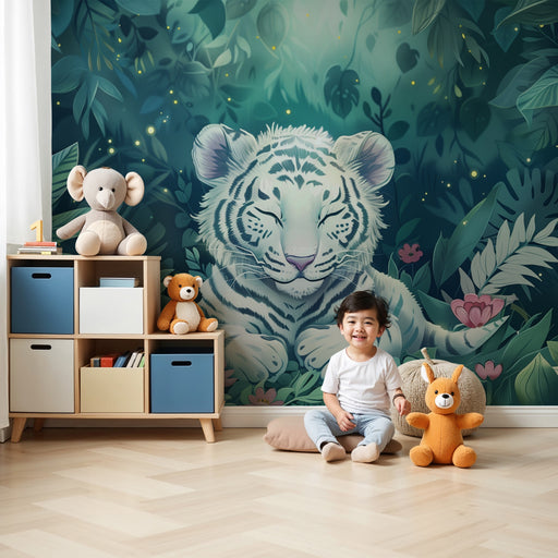 KidsWallVylepšite izbu vášho dieťaťa s naším jedinečným tapetou, ktorá zobrazuje pokojného bielého tigra v jasnej džungli s kúzelnými kvetmi. Tento očarujú...
