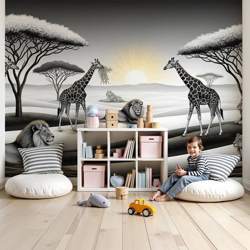 Zobraziť všetky podrobnostiDetská izba tapeta | Majestátne levice a žirafy v africkom krajinnom čiernobielym prostredí