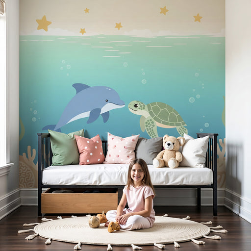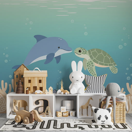 KidsWallPonořte sa do fascinujúceho podmorského sveta s týmto tapetou pre deti, ktorá zobrazuje hravé delfíny a jemné korytnačky. Tento farebný a hravý diz...