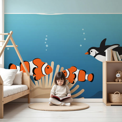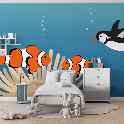 KidsWallPonořte sa do fascinujúceho sveta oceánu s týmto tapetou pre deti veselou a farebnou. Živé klauni ryby a zvedavý tučniak sa pohybujú v strede turko...