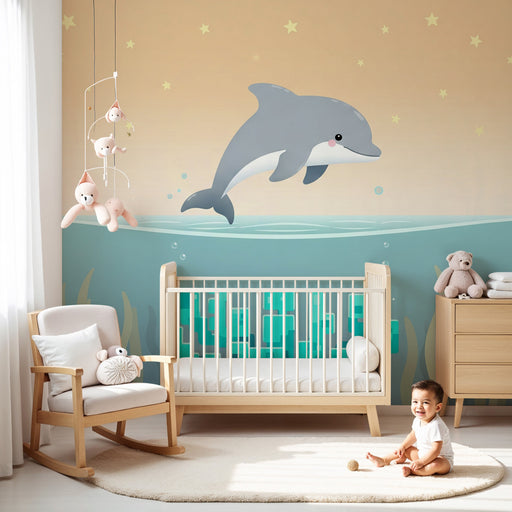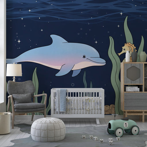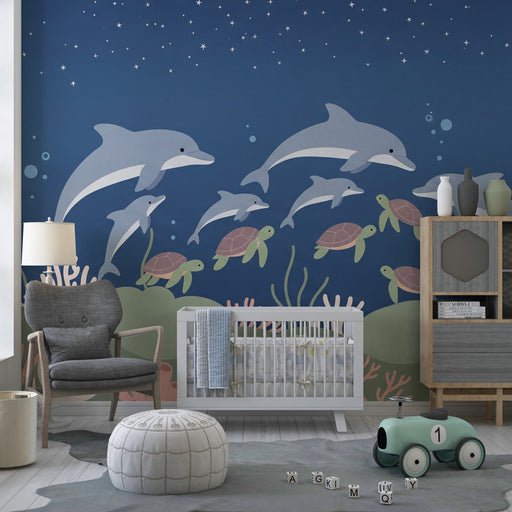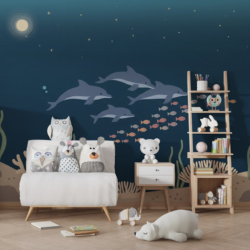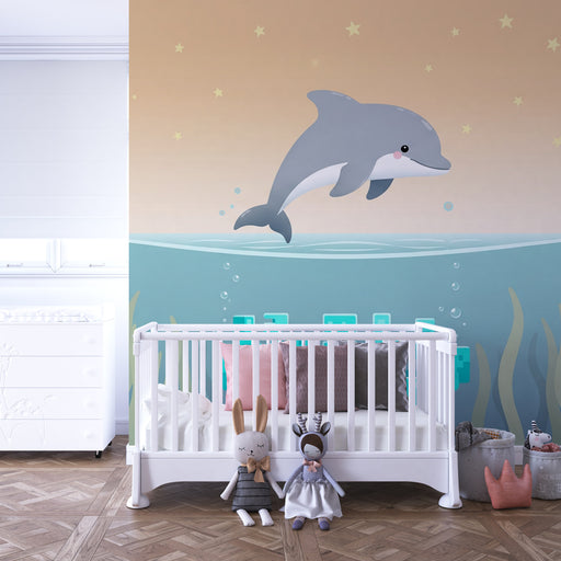 KidsWallPonořte sa do upokojujúceho sveta oceánu s touto tapetou do izby pre bábätká. Živý hravý delfín pláva radostne pod hviezdami, zatiaľ čo jemný mesia...