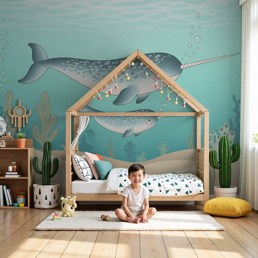 KidsWallPonořte svoje dieťa do fascinujúceho morského sveta s týmto papier peint pre bábätká, ktorý zobrazuje narvaly pokojne plávajúce v tyrkysových vodác...
